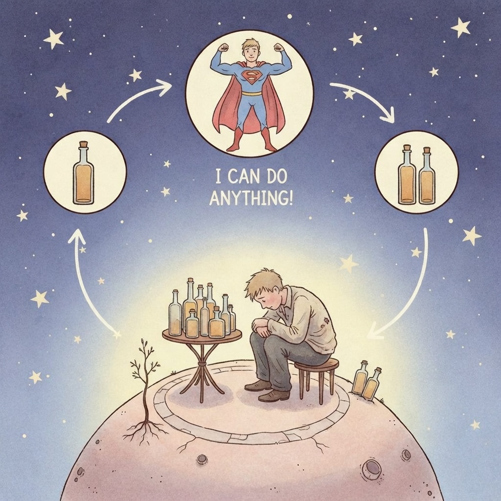 Cette boucle de rétroaction positive rappelle celle du buveur du Petit Prince de Saint Exupéry :