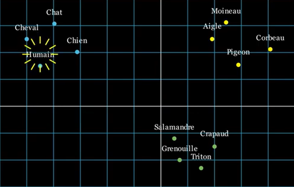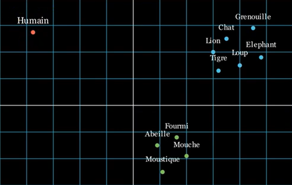 Le mot « humain » se retrouve isolé, loin des animaux et des insectes. Une catégorie à part.